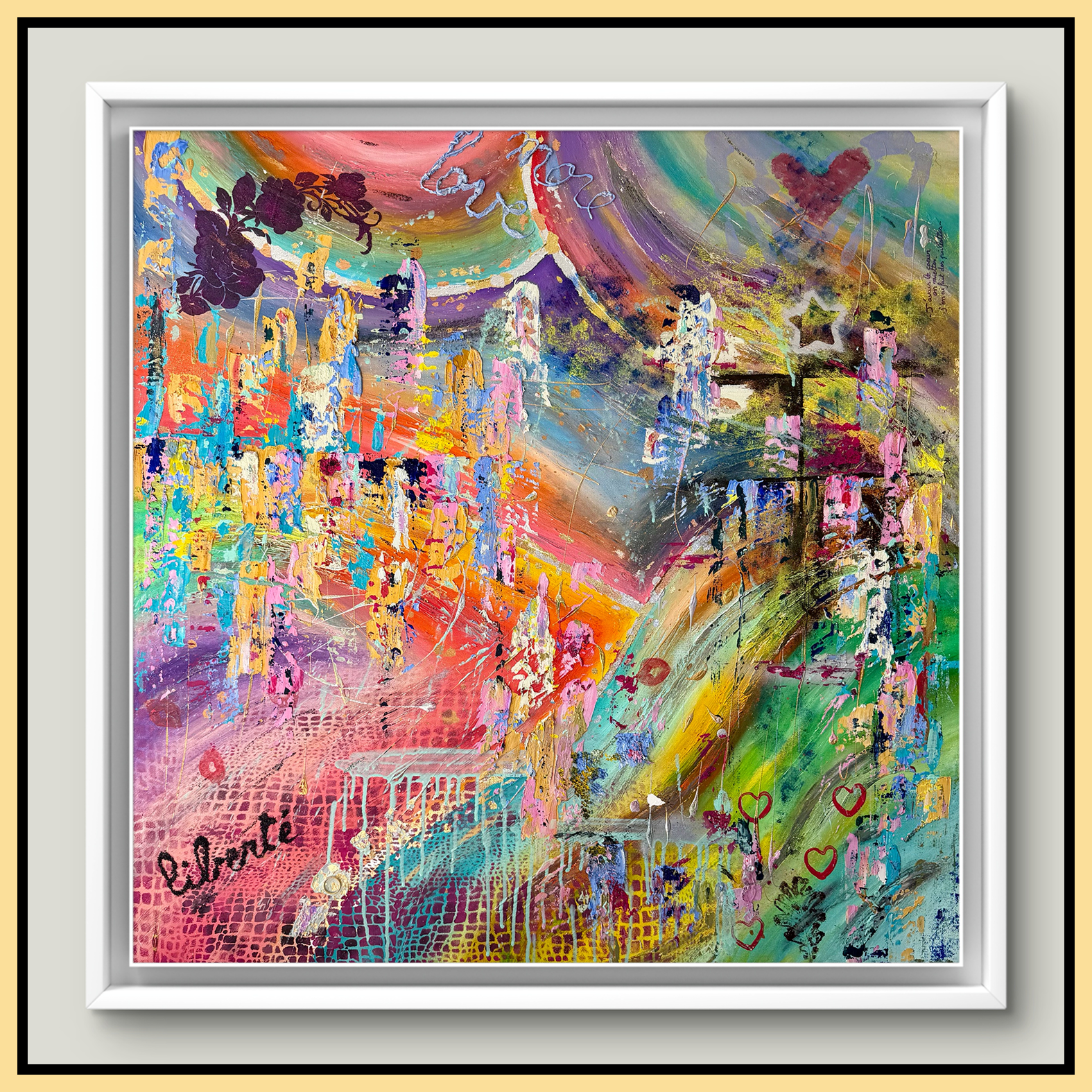 Mon travail s’exprime à travers de grandes toiles abstraites, souvent très colorées, réalisées aux doigts pour un rapport direct, instinctif et puissant à la matière.
